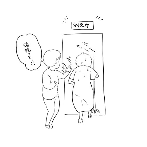 分娩室のむこうの廊下では、分娩室に向けた母の携帯から